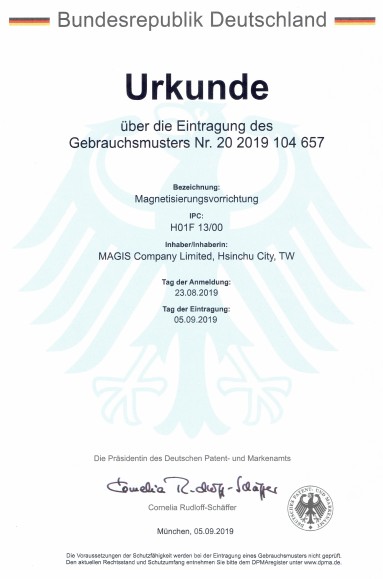 美洁斯獲得德國專利證書 Urkunde uber die Eintragung des Gebrauchsmusters Nr. 20 2019 104 657 Bezeichnung: Magnetisierungsvorrichtung IPC: H01F 13/00
