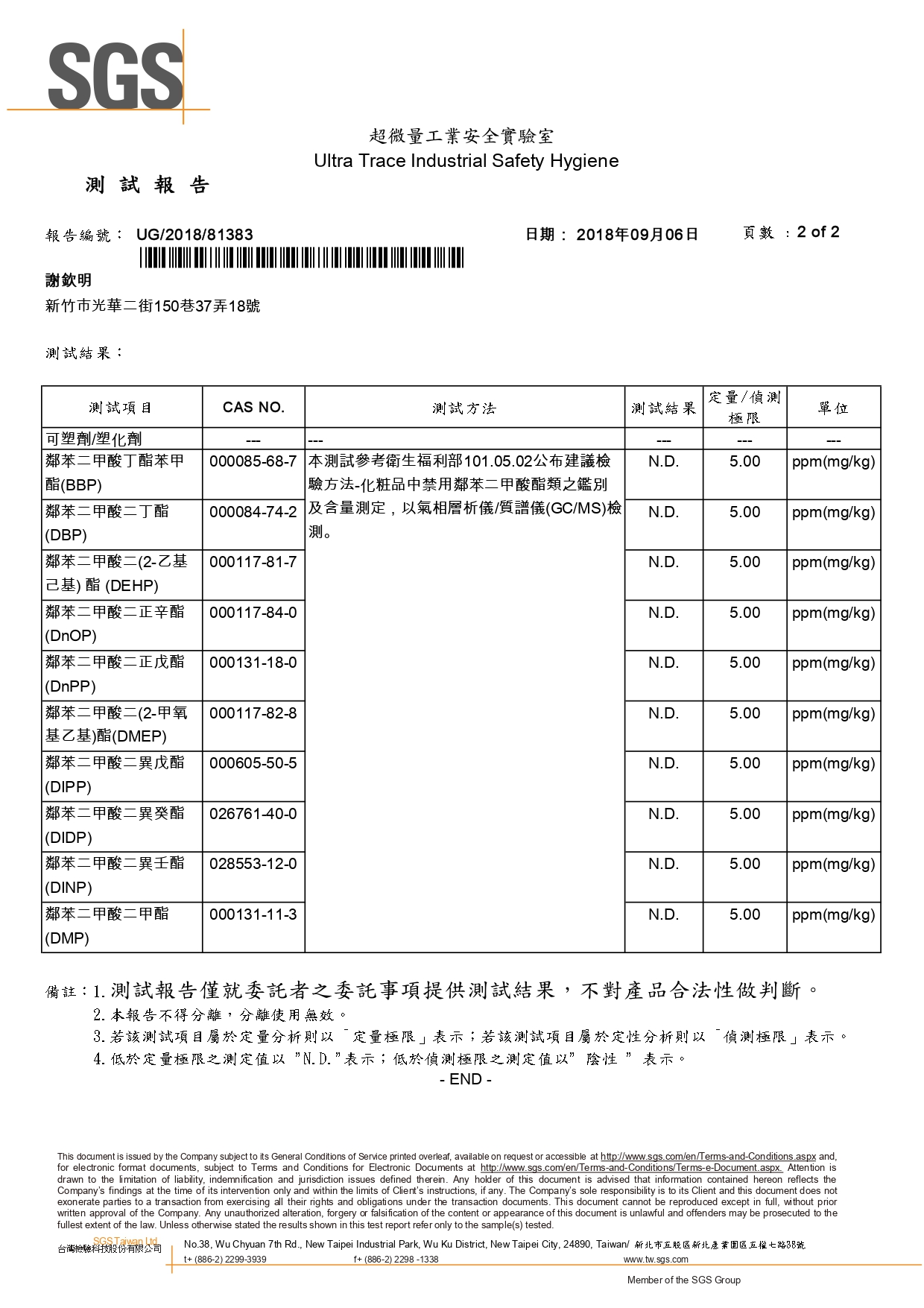 測試項目:可塑劑/塑化劑(測試項目十項),採衛生福利部檢測標準,合格。