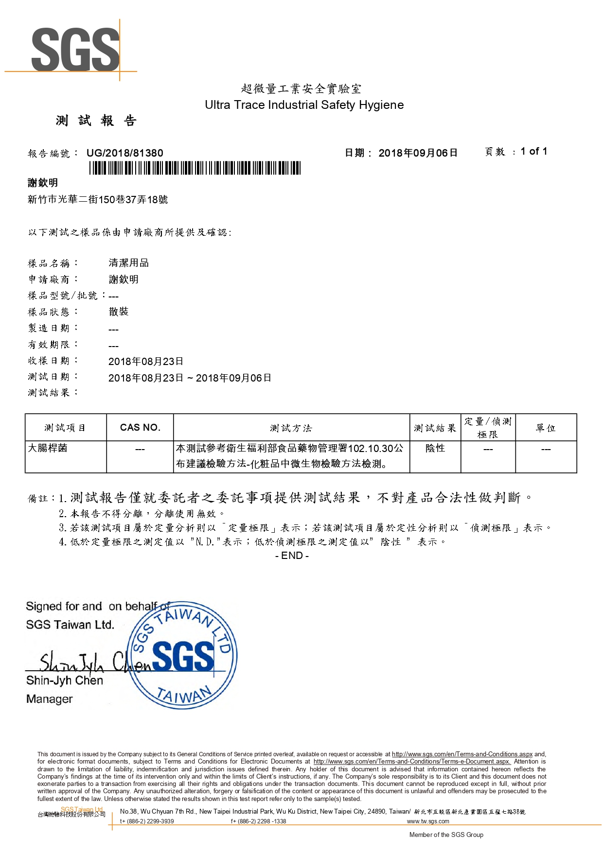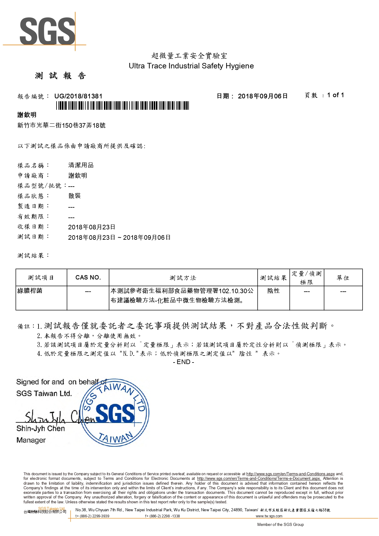 測試項目:綠膿桿菌,採衛生福利部食品藥物管理署檢驗方法,合格。